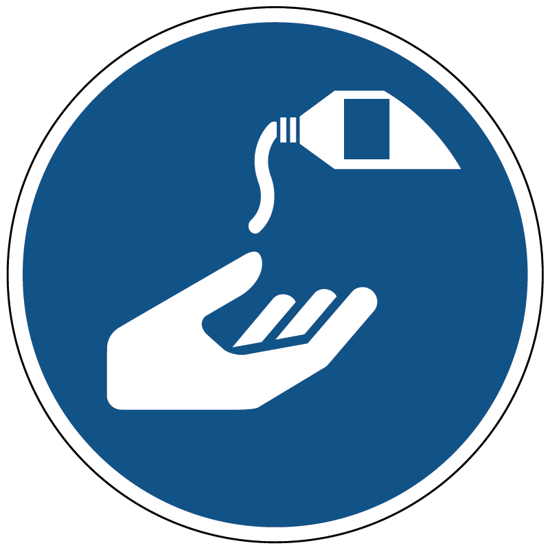 De gebruik beschermende créme gebodspictogram  is gemaakt volgens de veiligheidsnorm ISO 7010. Met deze oogbescherming verplicht pictogram geef je aan dat er een handeling verplicht is en uitgevoerd moet worden.