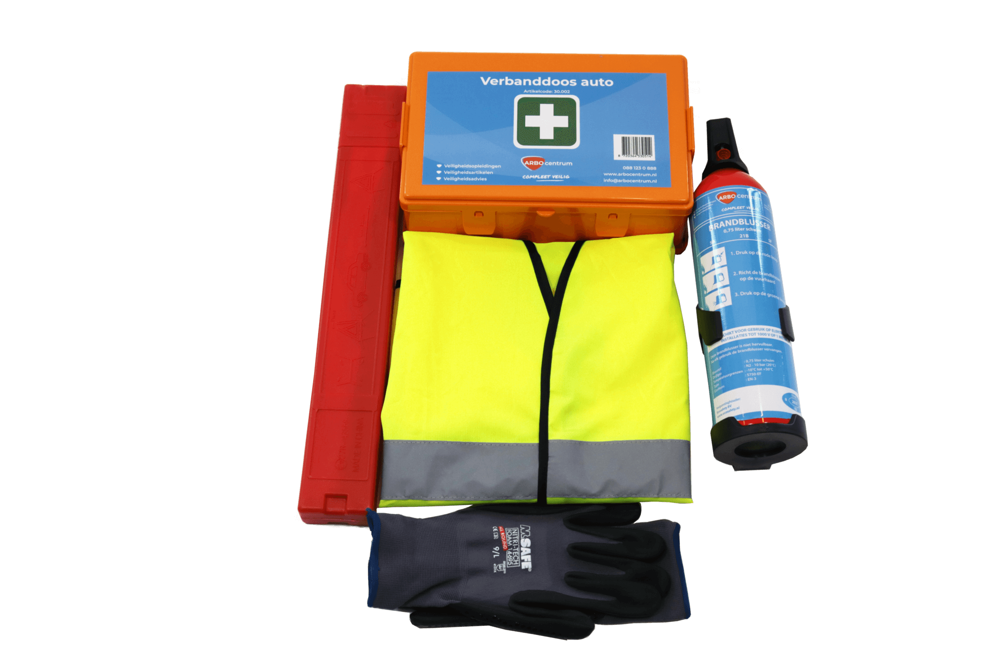 Ons Veiligheidspakket voor chauffeur bestaat uit een veiligheidshesje, werkhandschoenen, een verbanddoos, opvouwbare gevarendriehoek en een brandblusser.
